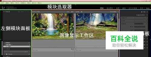 Lightroom的工作界面很简单,除了上面的标题栏和菜单栏外,主要分成了四大面板区域,中间是图片显示的工作区。围绕着中间的图像显示工作区。上面是模块选取器,下面是胶片显示窗格,左侧模块面板(导航目录、文件夹、收藏夹等)、右侧是重要的调整面板。