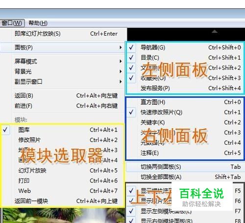 点开窗口>面板菜单,看到这些面板分别对应的快捷键。(这些是在图库模式下的快捷键)。最常用的快捷键就是F5、F6、F7、F8这四个快捷键,分别对应上下左右四大面板。