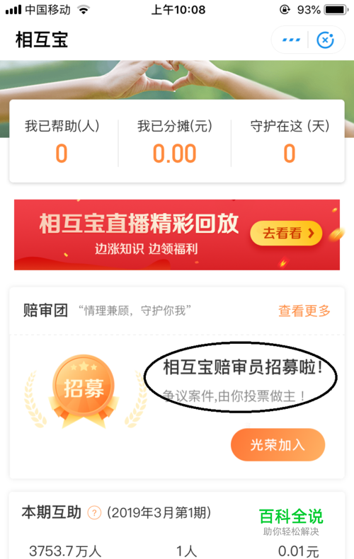 加入相互宝后打开你的个人相互宝的界面中找到“相互宝赔审员招募啦”点击“光荣加入”按钮。