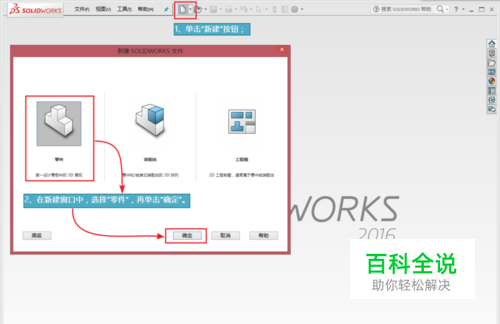 启动SolidWorks 2016中文版后,点击“新建”按钮,在弹出的窗口中,选择“零件”,再单击“确定”。