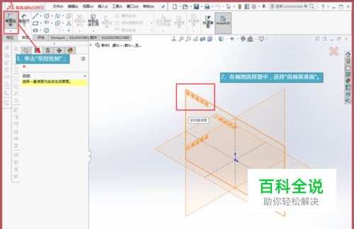 在新零件窗口中,单击左上角“草图绘制”,进入草图编辑窗口。在主窗口的编辑视图选择器中,选择“前视基准面”进行下来的操作。