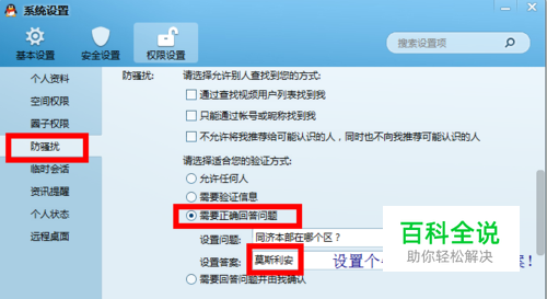 在权限设置页面勾选 拒绝任何临时会话,并且验证方式选择 需要正确回答问题!关键来了,设置一个牛头不对马嘴的答案,大神也回答不对啊!那你也不会有任何提示!所以说是间接!因为新版QQ已经取消了拒绝添加任何好友,有完美主义倾向的看下面一种方法!
