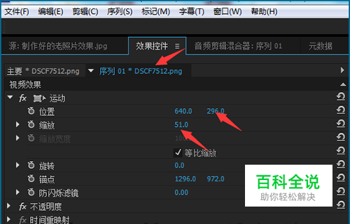 接上一经验中的操作步骤。这里导入的相片也是要比新建的序列大的。所以也要把这个相片的大小缩放到和序列一样的大小,这里需要注意的是,在缩放的时候需要看着前面的一个相片的参数进行调整。
