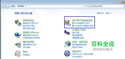 点开控制面板,选择“用户账户和家庭安全”(如图);