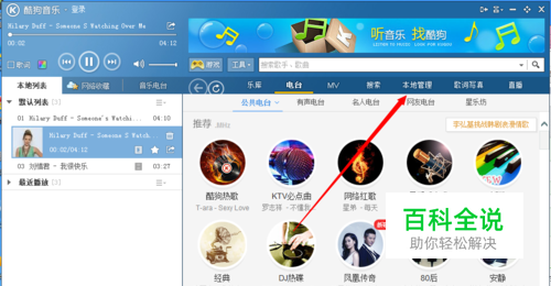 首先我们点击自己喜欢的歌曲,酷狗会自动缓存的,也就是下载啦。然后我们我们点击本地管理,也就是箭头指的地方。