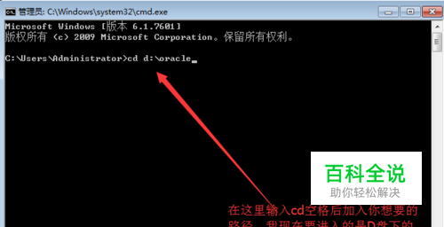 第四步: 在这个黑黑的窗口中,先输入cd 然后空格,接着是输入想要进到那个路径,也可以直接把文件拖进这个窗口,会自动变为路径的,然后回车。我以进入d:\oracle为例。