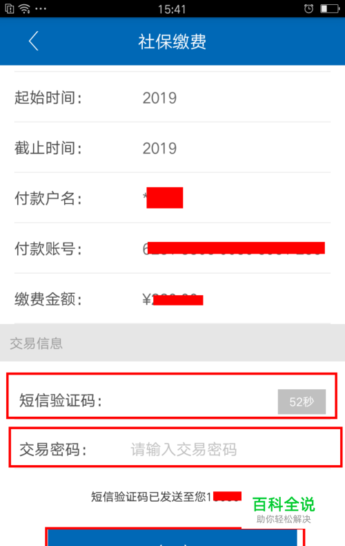 最后,就输入短信验证码和交易密码,点击确定就可以完成交易,完成后如果还要缴费其它人的费用,可以点击:再缴一笔。