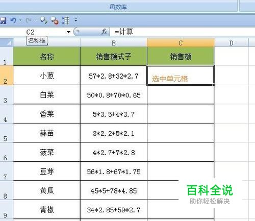 现在我们回到表中,在C2单元格中输入一个“=”,然后在回到菜单栏上“定义的名称”中找到“用于公式”,找到下面我们刚才新建的“计算”。
