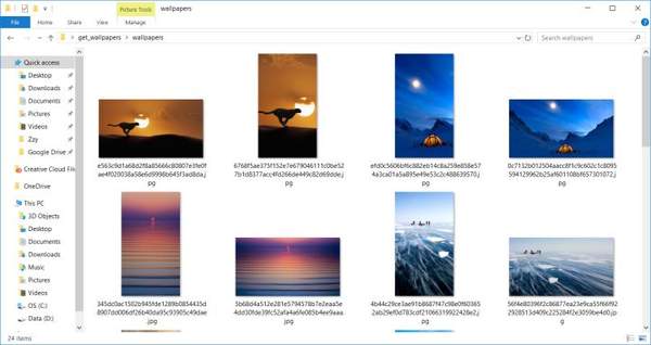 直接打开这个文件夹,里面会有随机命名的多个文件,每一个文件就是一张图片。但是由于文件没有扩展名,所以并不能预览。为了不搞坏系统文件,并且把这些文件变成可以预览的格式,我们用Python把这些文件复制出来,加上JPG作为扩展名。