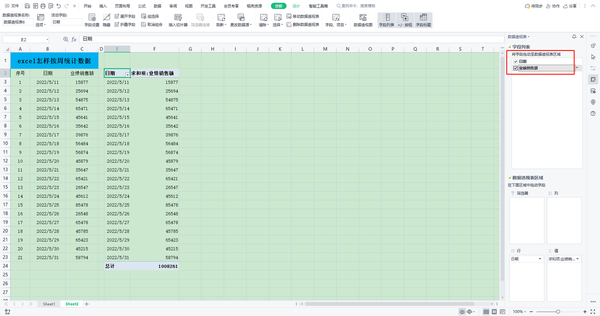 4、这时表格右侧会弹出数据透视表设置,我们在字段列表中将“日期”和“业绩销售额”勾选。