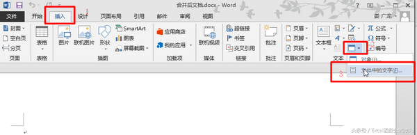 第三步:点击【插入】选项卡下面的【文本】组下的【对象】下的【文件中的文字】,弹出插入文件对话框。