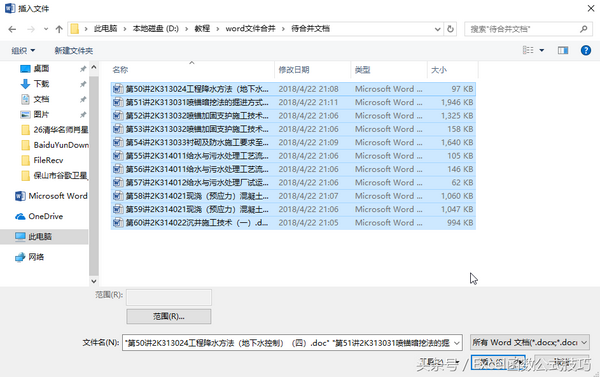 第四步:在插入文档对话框中选择需要合并的文件,注意文件的排序。选择后确定。