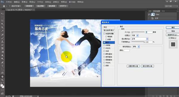 为图片2添加图层样式描边,描边就是利用颜色、渐变或者图案在图形周围描一圈,可以调整描边大小和不透明度。
