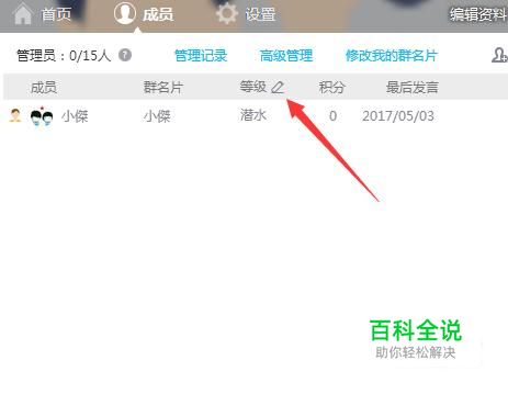 在这里我们可以看到群里所有成员的一些信息,包括昵称,活跃等级,最后发言时间等,这里是为了方便管理所有成员设置的。在等级旁边有一个笔一样的标志,点击这只笔。