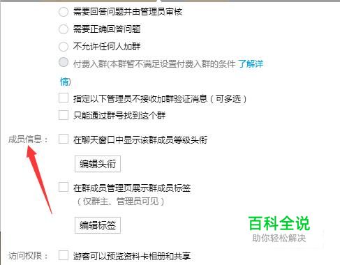 选择群编辑选项,接下来就是一些这个群的一些权限设置等信息,往下拉找到成员信息的版块。