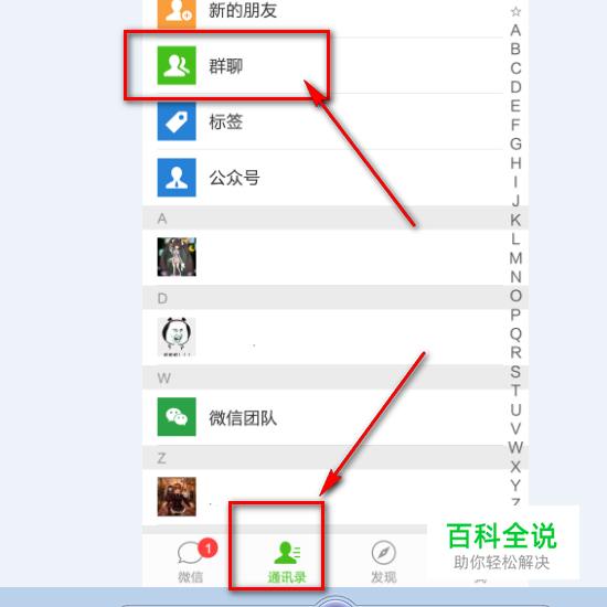 打开微信之后,点击“通讯录”,然后点击“群聊”。