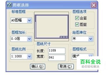 “插入图框” 功能:在对话框中,用户选择图幅大小、图纸比例、横竖方式等生成图框。 菜单:“图库”→“插入图框”。