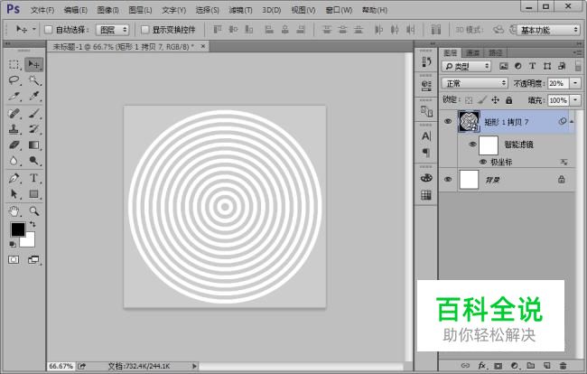 接着,我们执行滤镜-扭曲-极坐标命令,并把形状转化为智能对象,极坐标的形式选择“平面坐标到极坐标”。