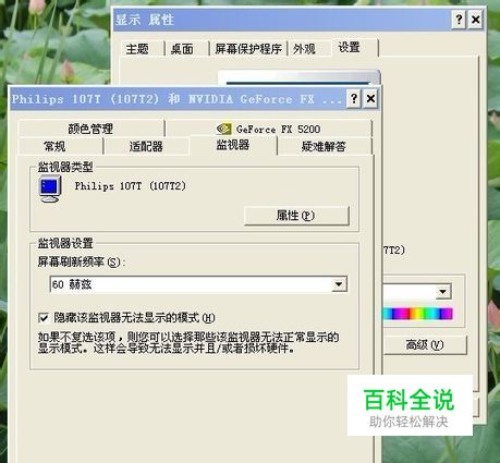 B、在显示器属性里将色彩调为16位色,将刷新率调为60HZ。
