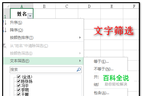 点“筛选”后,A1“姓名”右侧显出一个三角形。 在三角形这里点下,下方弹出相关的内容 鼠标放在“文本筛选”这里,右边即弹出子菜单,再点击“包含”