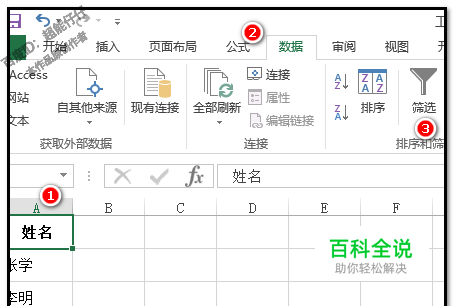 鼠标在A1单元格“姓名”这里点下,然后,再点“数据”选择卡; 接着,再点“筛选”