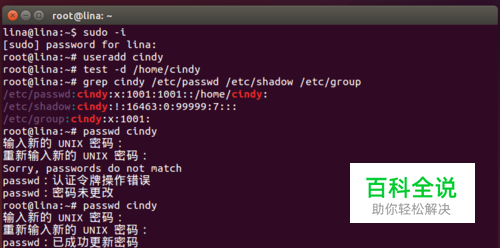 删除添加多余的用户,包含用户的主文件夹一同删除 输入命令:userdel –r cindy