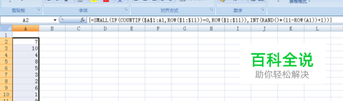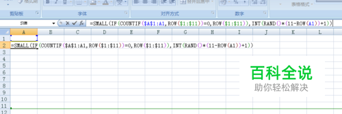 我们以生成1-10范围内的随机数字为例,讲述方法。 首先,在A2单元格中输入公式:=SMALL(IF(COUNTIF($A$1:A1,ROW($1:$11))=0,ROW($1:$11)),INT(RAND()*(11-ROW(A1))+1)) 然后按下Ctrl+Shift+Enter三键结束数组公式。
