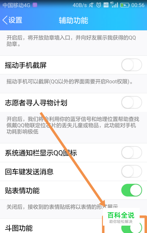 进入qq设置的辅助功能界面,在功能栏中找到【斗图功能】,然后点击斗图功能的开关按钮,将斗图功能开启;如图: