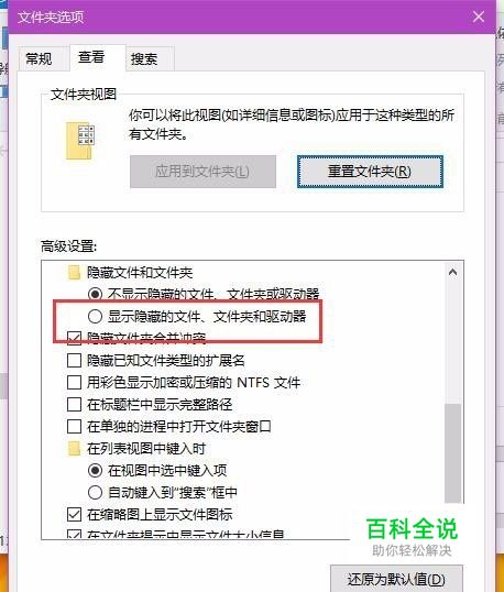 打开文件夹选项页面之后,点击页面中的“ 查看”选项,并点击选择允许查看隐藏的文件夹和文件,并点击“ 确定”按钮。