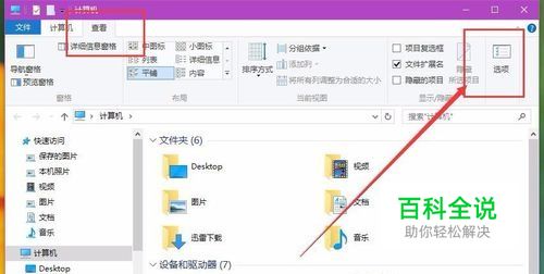 首先,请大家打开Win10系统中的计算机窗口主页面,在主页面中点击“ 查看”选项卡,然后点击页面中的“ 选项”按钮,打开Win10系统文件夹选项页面。