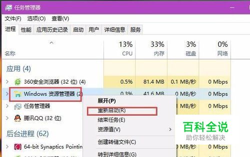 接下来,在打开的任务管理器主页面中,点击找到“ Windows资源管理器”,点击选中该程序,然后执行重新启动命令,重新启动之后接口重新刷新Win10系统图标缓存文件。