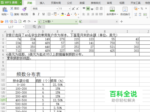 用一道例题来进行详细的说明。题目如图。 第一步,先对数据分组、统计,制作出一张频数分布表。题目要求以100美元为组距。