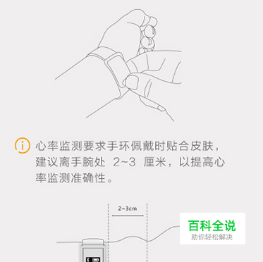 穿戴手环 如下图所示,扣合表带时,请用拇指按住表扣头,食指伸到表带内侧同一位置用力捏压扣合。