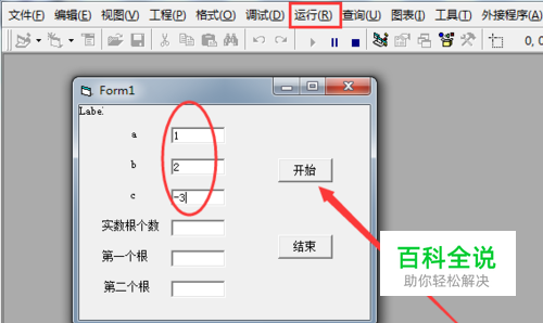 单击开始,结果两个根都显示出来了。单击结束,清空数据。测试成功了。