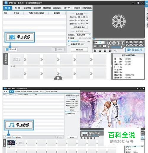 1.快速添加视频和音频 在“视频”面板,点击“添加视频”按钮,对视频进行导入。接着,在“音频”面板,点击“添加音频”按钮,配上背景音乐。