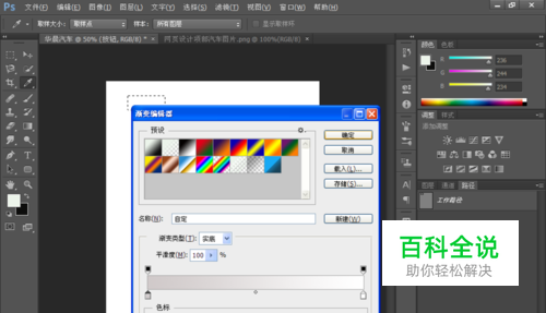 打开一张车的图片,移动到白色背景画布中,选择圆角矩形工具,选择路径为了方便转换为选区,设置为5个像素,像素越大,圆角矩形的四个圆角就是更加的明显,然后选择渐变工具,选中系统自带的黑白渐变,修改黑白渐变的颜色,改为灰白,也可以设置前景色为灰色,背景色为白色进行渐变的填充,然后点击确定。