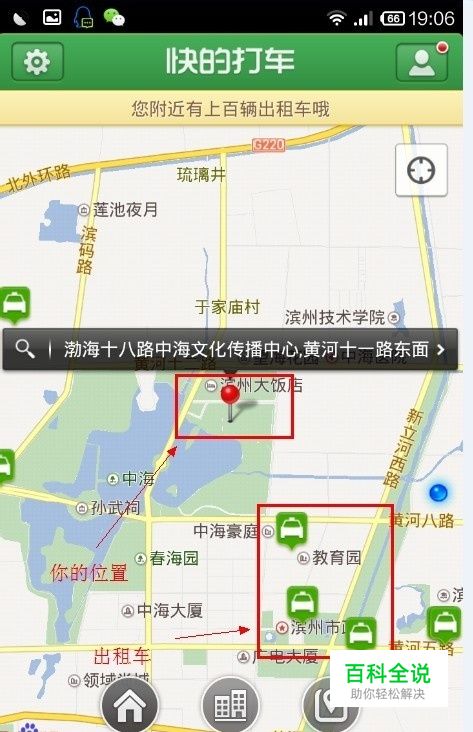 打开快的打车后,会自动进入地图界面,会显示当前你的位置和出租车的数量及位置信息。如下图。