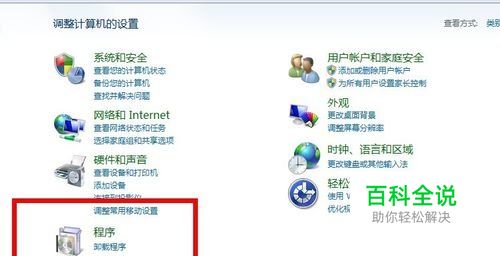 打开控制面板。找到 程序 那个选项,不一样的系统 那个功能的名称可能会不一样。