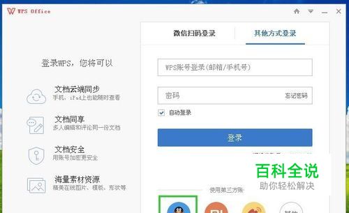 在WPS登录窗口中有多种登录方式供选择,例如:选择QQ账号登录,点击一下窗口下方的QQ图标开始使用QQ账号登录。