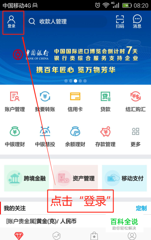 1.点击“中国银行APP”,跳过广告后,点击登录页面左上角“登录”。