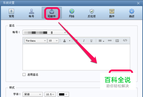然后,开始在签名去 设置你的签名,如图。同时,切记要 设置下方的前面应用在那个账号,新邮件、转发或回复页面,如图,设置好后,点击确定就可以了。