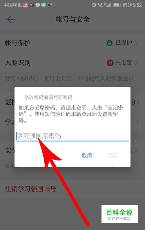 打开弹窗后,首先在指定位置输入学习强国app原密码,输入完毕后点击“确定”