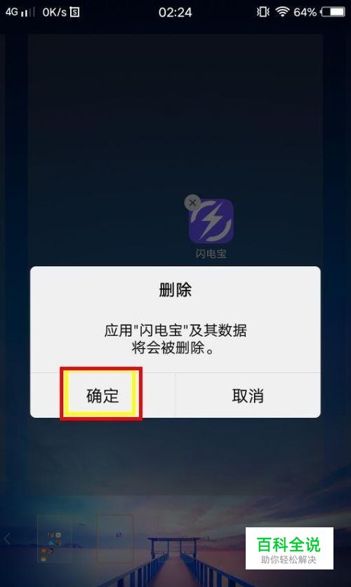 点击“闪电宝”快捷方式上的"X",删除卸载已经安装的闪电宝APP。在弹出的删除窗口,点击确认完成删除。