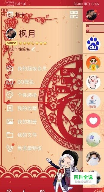 第二步下面我们来取消新年新装主题装扮,打开侧边栏之后,点击个性装扮,如下图所示:
