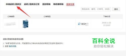 然后点击上面的“申请返修/退换货”,如图所示。