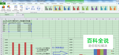 得到如下结果:图例为纸量和电量,横坐标为月份。 如何把图例变为月份,把横坐标变为纸量和电量呢?
