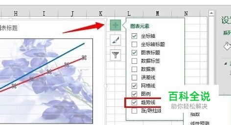 单击图表右上角的十字,选中“ 趋势线”,右击左边的 三角小标,然后选择 更多选择。