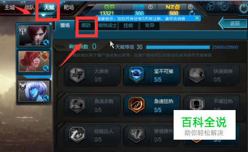 第一步首先登录到逆战游戏的页面,点击左上角的”天赋“,选择”塔防“这一项。