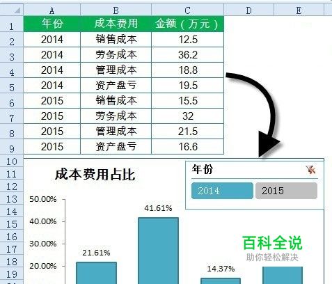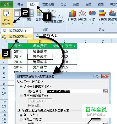 在这个图中,可以一目了然的展示不同年份各种成本的占比情况,比起干巴巴的数字,更具有说服力,下面咱们就说说具体的制作过程。 插入数据透视图 单击数据源中的任意单元格,按下图所示的步骤,插入一个数据透视图。