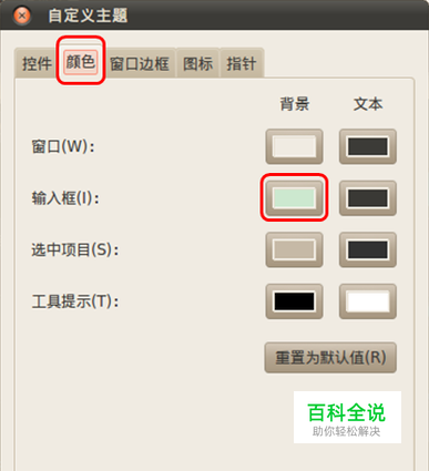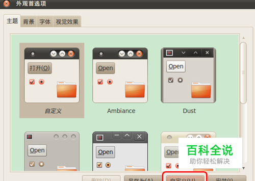 ubuntu系统保护色设置方法 桌面右键->更改桌面背景->主题->自定义(对话框右下角)->颜色->输入框->点击输入框右边的背景->颜色名称(输入#CCE8CF)-> 确定。